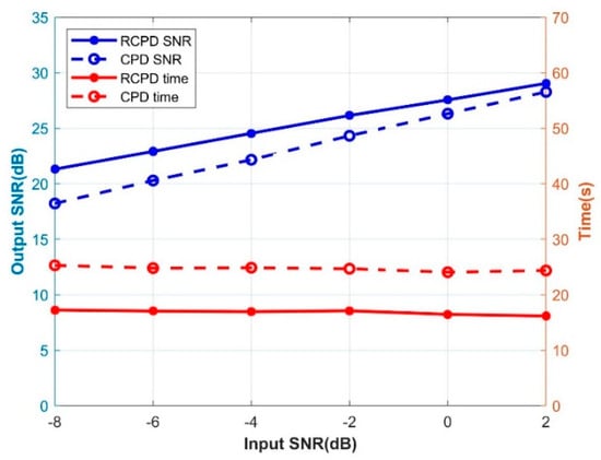 The output SNR and calculation time line chart of the RCPD algorithm and CPD algorithm for different input SNR (−8 dB~2 dB) data. The solid circle solid line represents RCPD, and the hollow circle imaginary line represents CPD. The output SNR is represented by blue, the running time is represented by red.