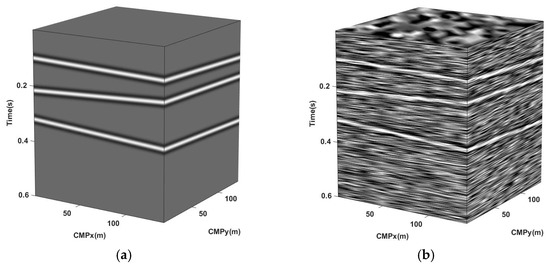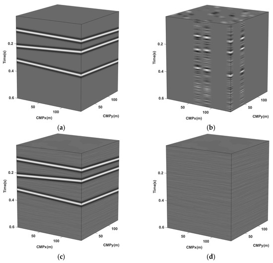 To verify the rationality of introducing linear Radon transform into the CPD method, we compare the reconstruction effect and calculation efficiency of the RCPD algorithm and CPD algorithm on synthetic data. The scale of the synthesized five-dimensional seismic data is , where is the time dimension, CMPx, are the CMP coordinate along , direction, and , are the offset along , direction. The time sampling interval is 2 ms. The synthesized data consists of three hyperplane waves; that is, there are all linear events in the four spatial dimension directions in the synthesized data.