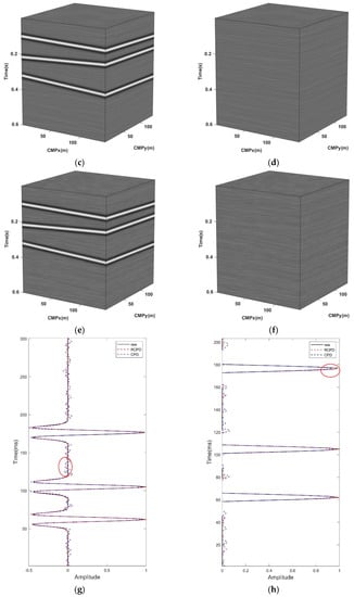 The third experiment aims to compare the performance of RCPD and CPD algorithms for amplitude fidelity in seismic data reconstruction. We synthesized a 5D data containing three linear events with amplitude ratios of 15:10:1 and AVO (amplitude variation with offset) characteristics in the direction. Gaussian white noise is added to the data to make the SNR −6 dB, and then randomly missing to 60%. Then, the RCPD algorithm and CPD algorithm are used to reconstruct the noisy missing data. The frequency band range processed by the two methods in this experiment is 1~100 Hz and the CP ranks of both algorithms are set to R = 5, and the iteration number of the CPD reconstruction method is set to 10. In addition, the regularization operator of the RCPD algorithm is set to 1, the penalty coefficients , are set to 0.5, , are set to 1.3, the minimum iteration error is , the maximum number of iterations is 150, the range of each ray parameter is , and is set to 100. Figure 8 displays the reconstruction results by two methods on noisy synthesis data with 60% missing containing AVO characteristics. Figure 8a shows a 3D slice of the original 5D data when , and Figure 8b shows the corresponding noisy missing data with 60% missing. The RCPD reconstruction result and data residual are illustrated in Figure 8c,d, and the CPD reconstruction result and data residual are illustrated in Figure 8e,f (we use a smaller grayscale range to represent the data residuals to better show the difference between the two methods). Figure 8g shows the single-trace reconstruction effect comparison of the 5D data missing trace , in which the black solid line is the original noise-free data, the red dotted line is the RCPD reconstruction data, the blue dotted line is the CPD reconstruction data, and Figure 8h is the amplification display at the wavelet peak of the trace. As a result, both methods can suppress noise and interpolate missing traces while preserving amplitude of high-dimensional seismic signals. As can be seen from Figure 8c to Figure 8h, the RCPD method performs better than the CPD method in protecting the amplitude of the reflected signal.