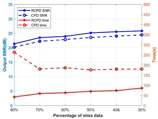 The output SNR and calculation time line chart of the RCPD algorithm and CPD algorithm for different percentages of miss data (80~30%) data. The solid circle solid line represents RCPD, and the hollow circle imaginary line represents CPD. The output SNR is represented by blue, the running time is represented by red.