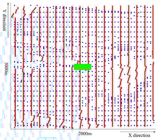 The distribution of the source, receiver point, and CMP. The red represents the source point, the blue represents the receiver point, and the green represents CMP.