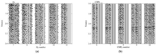 Figure 10 and Figure 11 show the reconstruction effect of the RCPD method and CPD method on the 5D field data. In order to display the results more clearly, we expand the 3D CMP gathers with fixed CMP coordinates and the 3D common-offset gathers with fixed offset coordinates into 2D images for display. Figure 10a displays the gather (, ) with the number from 7 to 11, and Figure 10b displays the gather (, ) with the number from 6 to 10. Figure 10c,d depict the reconstruction effect of the RCPD method and Figure 10e,f depict the reconstruction effect of the CPD method. In order to show the difference between the two methods in data reconstruction more clearly, Figure 10g,h show the comparison of reconstruction effects of noisy single trace and missing single trace, respectively. Figure 11 shows the grayscale display of common-offset gathers, which corresponds to the data in Figure 10b, Figure 10d, and Figure 10f, respectively.
