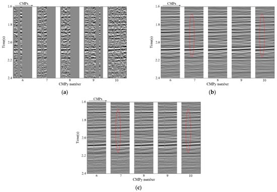 Grayscale display of the common-offset gather with number 6~10 (, ) of 5D field data. (a) Before reconstruction; (b) reconstruction result by RCPD method; (c) reconstruction result by CPD method.