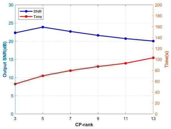 The output SNR and consumed time of the RCPD algorithm for different CP-rank (3~13). The blue represents the output SNR, and the red represents the consumed time.