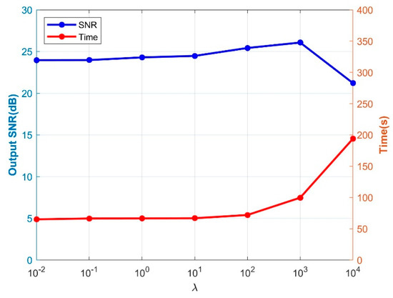 The output SNR and consumed time of the RCPD algorithm for different regularization parameter (10−2~104). The blue represents the output SNR, and the red represents the consumed time.