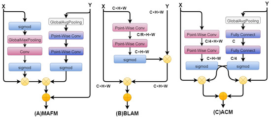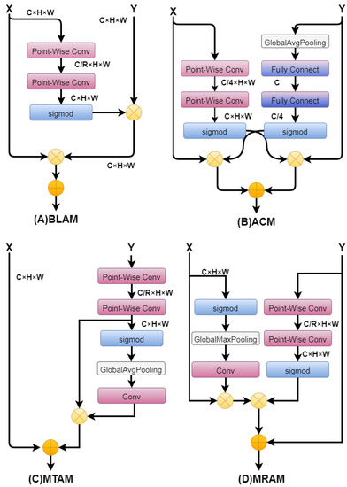 - Influence of multimechanism attention collaborative feature fusion module. Table 5 and Table 6 present the different feature fusion methods and strategies we adopted. Figure 15 show the structure diagrams of each fusion method. We selected the bottom-up attentional module (BLAM) and asymmetric contextual modulation (ACM) and multimechanism top-down attention module (MTAM) and multimechanism reverse attention module (MRAM) integrating channel attention mechanism [21]. We replaced the MAFM with the above modules to verify the effectiveness of the MAFM. As shown in Table 5, Table 6 and Table 7, SIRST and IDTAT were selected as the datasets. Our proposed MAFM has the optimal effect.
