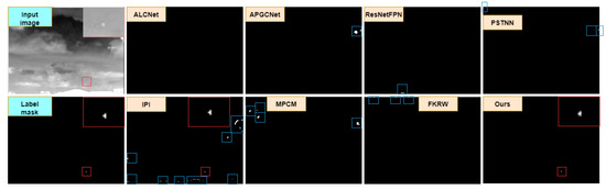 - Comparison Network: To prove the effectiveness of MDFENet, we compared the proposed method with other model- and data-driven methods. From the data-driven methods, we selected FPN [31], the attention local contrast network [19], and the attention-guided pyramid environment network [17]. We select these data-driven methods for comparison because our network was inspired by the above networks and proposed our new models and ideas on this basis. Therefore, we select the above networks as the baseline to make a fair comparison and prove the superiority of our proposed models and ideas. These methods have the same optimizer and other hyperparameters as the proposed method. In the traditional method, two classical methods and two new methods are selected, which are MPCM algorithm [10], IPI algorithm [14], PSTNN algorithm [18], and FKRW algorithm [26]. MPCM and IPI are classical algorithms in infrared small-target detection and have a relatively wide influence. PSTNN and FKRW are advanced model-driven methods in recent years, and their comparison can better prove the superiority of our method.