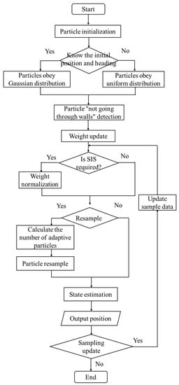 The current research mainly focuses on the of navigation and positioning methods for indoor pedestrians when the initial positions and heading are known in a special working environment. The initial particles are added with Gaussian white noise, as shown in Equation (2), and the initial particles obey
