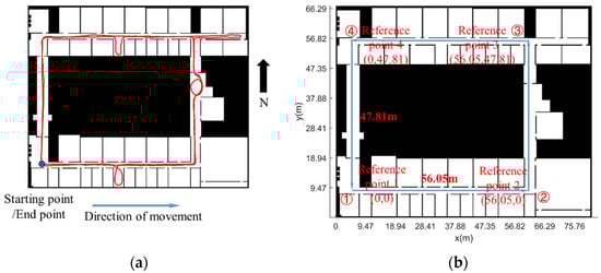 The simulation environment is based on the architectural plan of the fifth floor of no. 1 Building and no. 2 Building of the College of Automation Engineering, as shown in Figure 5. In Figure 5a, the red line indicates the corridor path. The four black dots (①②③④) represent the reference point of the relative position.