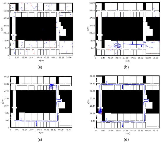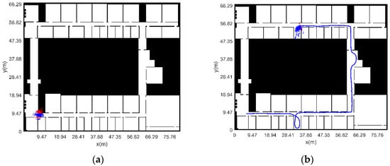 The distribution of sampled particles is shown in Figure 17. Initially, particles are uniformly distributed throughout the map, with red representing “illegal particles” and blue representing passable “legal particles”. Starting from the 114th step, the general location of the pedestrian is searched. With the continuous movement of the pedestrian, the navigation and positioning function is finally provided for the pedestrian. There is a possibility of symmetry in the indoor structure, and pedestrians may not know in advance. According to the structural characteristics of indoor rooms, corridors, etc., the global search can be realized as soon as possible by increasing the path complexity.