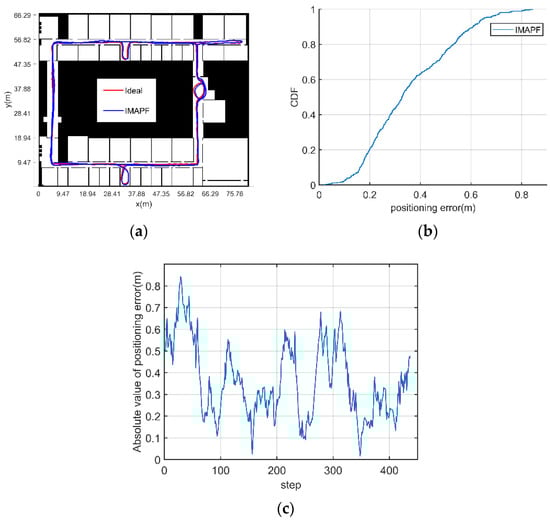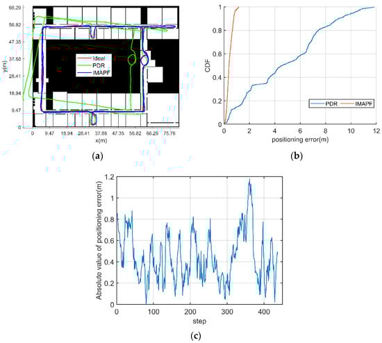 Figure 8 shows the navigation trace comparison and its positioning error CDF curve with an known initial position and heading. In Figure 8a, the red line represents the ideal trace without noise, the green line represents the trace with noise calculated by PDR, and the blue line represents the trace diagram of the IMAPF method proposed in this paper. It can be seen that the method proposed in this paper can well correct the position of the navigation system. Figure 8b shows the CDF curve, which shows that the algorithm proposed in this paper is better than the PDR method in error correction. Figure 8c shows the error of each step.
