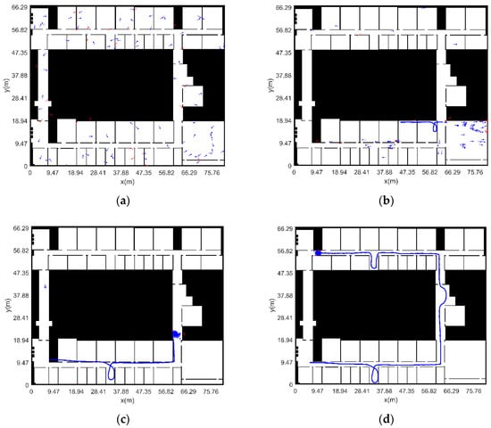 Distribution of sampled particles and motion trace with unknown initial position and heading. (a) Particle distribution at initial moment. (b) Particle distribution and motion track of the 58th step in the motion process. (c) Particle distribution and motion track of the 114th step in the motion process. (d) Particle distribution and motion track of the 190th step in the motion process.