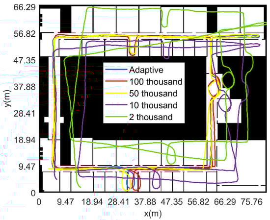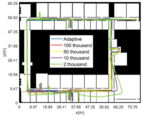 Figure 19 shows the pedestrian motion trace obtained by different particle numbers. Comparing the navigation results of five different particle numbers, the adaptive particle number method proposed in this paper is close to the navigation positioning error value when the fixed number of particles is 50,000. The error is small when the number of fixed particles is smaller, but the calculation time of the adaptive particle number method is reduced about 4.7 times lower compared to the calculation time of 50,000 fixed particles.