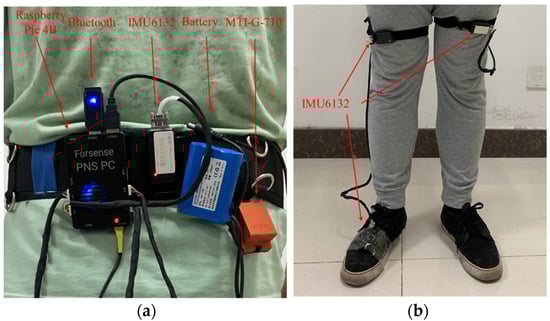 Schematic diagram of sensor installation. (a) Installation diagram of sensors on waist. (b) Installation diagram of sensors on leg and foot.