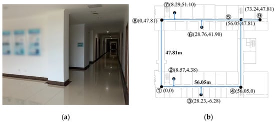 The experimental site is the fifth floor of No.1 Building and No.2 Building of the College of Automation Engineering. The experimental trace and indoor experimental scene are shown in Figure 13. The experimenter started from position ① (0, 0) and walked counterclockwise to collect two rounds of data. The experimenter experiences the reference point in the order of ①②③④⑤⑥⑦⑧①③④⑤⑨⑦⑧①. Additionally, the trace included multiple “entering the house” behaviors. The actual movement time in the experiment is 451.74 s.
