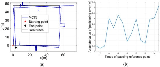 The trace solved by the MCIN method and the positioning error of the reference point experienced 15 times are shown in Figure 14. The mean error of the reference point position is 1.98 m, and the maximum error is 4.16 m. For Figure 14b, if the MCIN method based on inertial navigation only is adopted, the navigation error will gradually diverge. Due to the uncertainty of course error divergence, the navigation solution results of some paths in a closed path will show smaller errors.