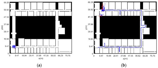 The distribution of sampled particle is shown in Figure 15. The step length and heading change of the particles obey the Gaussian distribution. Initially, the particles are distributed in the range near the starting point, where red represents “illegal particles” and blue represents passable “legal particles”.