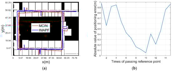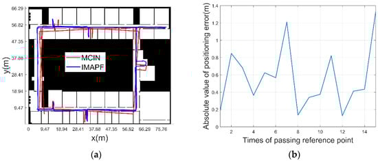 Figure 18 is the comparison diagram of positioning trace under the condition of unknown initial position and heading. In Figure 18a, the red line represents the trace of the MCIN method, and the blue line represents the trace of IMAPF method. It can be seen that with the increase of time, IMAPF method can well correct the position of the navigation system. Figure 18b shows the absolute value curve of the positioning error under the condition that the initial position and heading are unknown. As the pedestrian keeps moving, navigation and positioning functions are gradually provided with map constraints. After 114 steps, functions of navigation and positioning can be provided for pedestrians in the map. Figure 18b shows the absolute value of the positioning error calculated according to the final navigation and positioning results, so the errors of the first two reference points are not considered. It can be seen that the algorithm is effective in correcting errors, which can be limited in a certain range and do not diverge over time. The mean error of IMAPF method is 1.06 m, and the maximum error is 1.33 m.