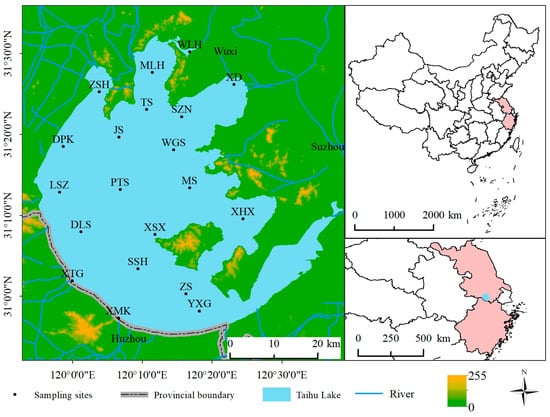 Taihu Lake (30°55′–31°33′N, 119°52′–120°37′E) is mainly located in the southern Jiangsu province and covers parts of the Jiangsu and Zhejiang provinces, including some cities such as Wuxi, Suzhou, Changzhou, and Huzhou. The water area, total shoreline length, average water depth, maximum water depth, and total water storage of Taihu Lake are 2428 km2 (the water surface area is 2338 km2, and the island area is 90 km2), 393.2 km, 1.90 m, 3.34 m [], and 4.40 × 109 m3 [], respectively []. Most of the runoff comes from the southwestern mountainous watershed and flows out at the east side of the lake after regulation and storage []. It has a subtropical monsoon climate, with an average temperature of 14.90–16.20 °C and an annual precipitation of 1000–1400 mm [,].