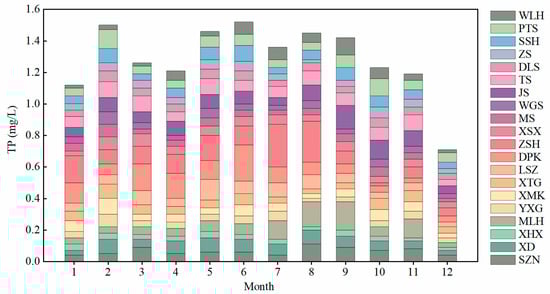 The TP concentration changed from 0.02 mg/L to 0.27 mg/L, and the average was 0.07 mg/L (Figure 2). The mean TP concentration in summer and autumn (0.07 mg/L) was higher than that in spring and winter (0.06 mg/L). The TP concentration at all sampling sites is higher in February, May, June, July, August, and September. In months except for February, the most significant changes in TP concentration in Taihu Lake were observed in the middle of each year. The suitable water temperature in the summer and fall provides better environmental conditions for algae growth [], while Taihu Lake is hypereutrophic. Therefore, the TP concentration in the warm months was selected for the study.