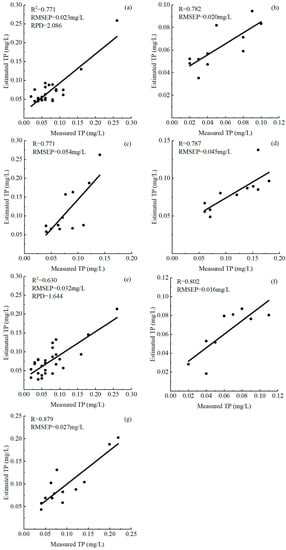 A relatively satisfactory correlation is observed between the estimated and measured TP concentration (Figure 3). Figure 3e shows the ideal model of the training dataset, which had an R2, RPD, and RMSEP of 0.630, 1.644, and 0.032 mg/L, respectively, indicating the algorithm could be used to estimate the TP concentration. The scatter plot of the testing dataset revealed that the correlation coefficient and the RMSEP between the estimated and measured TP concentrations were 0.802 and 0.016 mg/L, respectively (Figure 3f). To prove the accuracy and extensibility of the model, formula 6 was applied to the Landsat-8 images acquired on 30 July 2017 2017. After eliminating the sampling sites related to the effects of cloud, land, and aquatic vegetation from the images, satisfactory results were achieved from the optimal algorithm, where the R and RMSEP of the verification set (30 July 2017) reached 0.879 and 0.027 mg/L (Figure 3g).