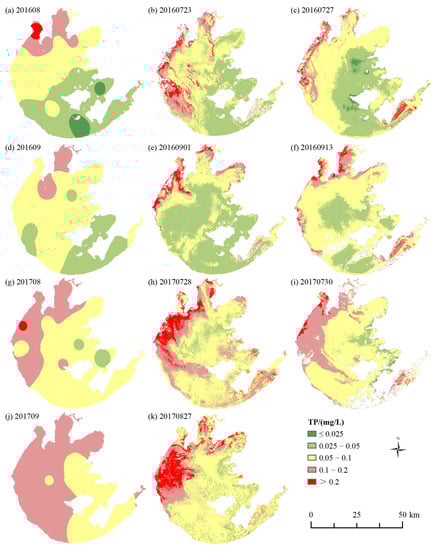 Similarly, the optimal models were applied to the Sentinel-2 image acquired on 27 August 2017, to map the TP concentration of late August 2017. In Figure 4k, the low TP concentration is mainly located in the eastern and southern regions, while the high concentration (higher than 0.20 mg/L) is dominant in northwestern areas.