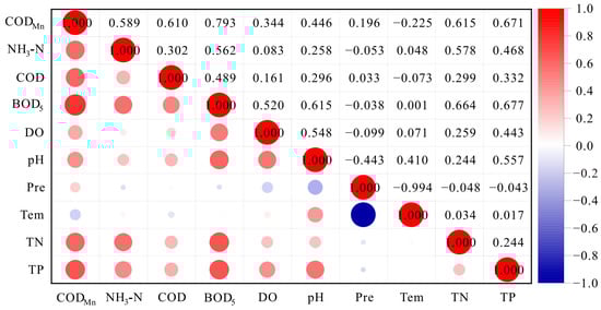 Correlation analysis is a term used to denote the association or relationship between two (or more) quantitative variables []. The experimental data were analyzed using statistical product service solutions (SPSS 22.0) and Origin 2022. Band reflectance and TP concentration were subjected to correlation analysis to investigate the relationship between the spectral reflectance and TP concentration. Pearson’s correlation coefficient was calculated to reveal the relationship between TP and various environmental factors (CODMn, BOD5, NH3-N, TN, DO, pH, COD) and meteorological factors (precipitation and temperature). The equation for the correlation coefficient is: