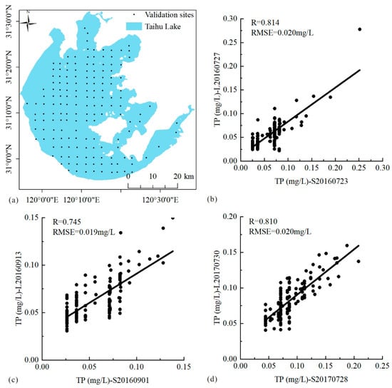 The Landsat-8 and Sentinel-2 images used in this study were applied to verify the model accuracy in Table 2. The predictions of the different models were compared with the measured TP concentration in this study, and the correlation coefficients and root mean square errors were calculated (Table 2). Because the bands of Landsat-8 and Sentinel-2 images are relatively similar, the prediction accuracy based on these two images is similar, which further indicates that the two images are complementary. The prediction accuracy of both Landsat-8 and Sentinel-2 images for Taihu Lake is relatively high compared to other lakes. The model has the best validation results (R = 0.720) [] with the data collected from Taihu Lake in July and August 2018. The study [] had the same sampling locations and dates as this study, so the accuracy of predictions was relatively high. This demonstrates that stable regional models can estimate TP concentrations in different years.
