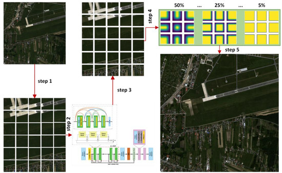Methods that use deep neural networks make it possible to process large datasets quickly and to extract information that would be impossible to extract with the use of digital image processing methods. In order to use the designed architectures for other purposes than those for which they were dedicated, it is necessary to prepare a database of training data in such a way that the data will meet the input parameters of the network (height, width, and number of channels). Unfortunately, this operation leads to changing the values of pixels in the image, which may, in turn, result in the loss of information from the image. A review of the size of the parameters that define the entry to the network reveals that they are significantly smaller than the dimensions of images that are acquired by optoelectronic sensors installed on UAVs, Reconnaissance aircrafts or EO satellites. Moreover, even nanosatellite systems that are equipped with small arrays, e.g., CMOS [18] or CMOSIS CMV [19], characterized by a low quantum yield have a much higher resolution than that of the designed input to the neural networks. In order to apply the solutions that use deep neural networks, it is thus necessary to divide the imagery into smaller images of specific dimensions, and the training process should be performed according to the diagram below (Figure 1). The result of this procedure is a set of resulting images, yet not the whole image. This gives rise to the question: how to combine the obtained results?