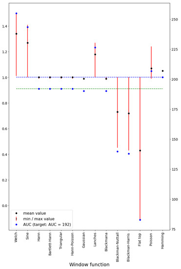 Considering the obtained results, which are additionally visualized in Figure 3, one may notice that the properties defined above are met only by the following windows: Hann, Bartlett-Hann, Triangular, and Hann Poisson. Additionally, it is worth noting the Backman window, which does not meet only the condition that refers to the sum of weights of the windows. As far as the Backman window is concerned, the sum of all weights equals 190.08, which is 1.92 lower than the target. Additionally, at the further stages of research, the Gaussian, Lanchos, and Blackman window functions will be tested. They do not meet the condition introduced by the authors at all, but, at the same time, the sums of weights do not diverge significantly from the target.