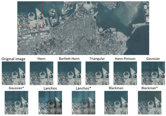 Table 2 and Figure 4 present the results of the final stage of preliminary research. The tests were conducted on one of the images from the sequence of images acquired by the Jinlin minisatellite. The prepared image was divided into component images of the dimensions 384 × 384 pixels with an overlap of 192 pixels (50%). Then, the prepared images were combined with the weights calculated with the use of the Hann, Bartlett-Hann, Triangular, Hann-Poisson, Gaussian, Lanchos, and Blackman window functions. The quality of the obtained resultant image was analyzed based on the evaluation metrics described in point A. The obtained results clearly reveal that those windows, where the sum of weights for a single pixel equals 1, present the best results of the evaluation metrics. Apart from that, combining images based on weights determined with the use of window functions leads to a slight deterioration in image quality, which is proven by the low value of MSE and RASE errors. At the same time, the Peak signal-to-noise ratio (PSNR) takes high values, e.g., for the Hann window PSNR = 51.89 dB, which means very high similarity between the resulting image and the reference image. As for the windows, for which the sum of weights in a point in the overlap area is different from 1, horizontal and vertical stripes are visible in the resulting images. If the value of the sum of weights is lower than one, the DN values for those pixels are lower than the target value, which, in consequence, leads to the emergence of a dark grid. On the other hand, if the sum of weights is higher than 1, the DN value of the pixel is higher than the target value, which results in the emergence of lighter stripes (Figure 5).