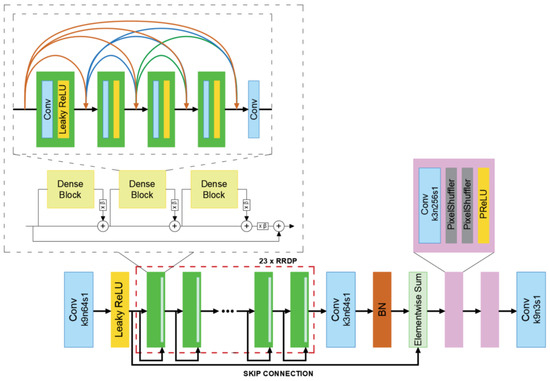 As it was mentioned before, the ESRGAN model is a modification of the SRGAN network. The batch normalization (BN) layers have been removed from its generator, and the basic block was replaced with a Residual-in-Residual Dense Block (RRDB), being a combination of a multi-level residual network and dense connections (Figure 7). The removal of the BN layers resulted in stable training and improved network capacity (the time required for training became much shorter), which is a result of the reduced computational complexity. In cases when the statistical data of the training and testing processes differ significantly, the BN layers tend to generate artefacts in the SR image. This phenomenon comes from the difference between the datasets that are used to calculate the average and the variance. During network training, they are calculated based on a certain batch of images, while at the stage of testing information from the whole dataset is used. Another modification of the generator network can be found in the implementation of RRDB blocks that have a residual structure. This solution makes it possible to increase the network capacity, which, in turn, improves its performance.
