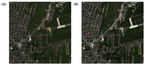The spatial resolution of the images was improved with the use of the Gram–Schmidt method [54,55,56]. The main reason for choosing this method was the fact that the color distortions are the lowest (in comparison to other methods). Figure 6 presents sample pairs of LR and HR images.