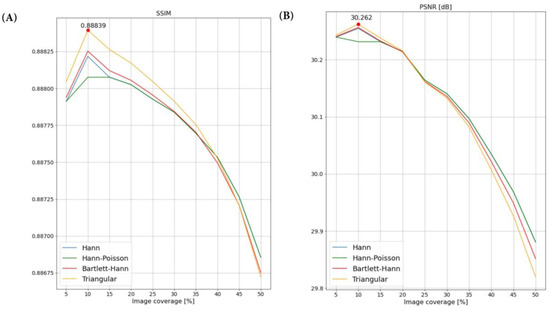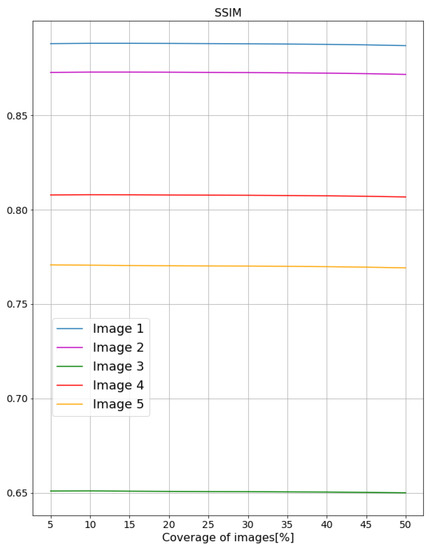 Structural similarity index measure (SSIM) [49] (Equation (4)) is a measure of the structural similarity in the image domain, additionally taking into account the changes in brightness and contrast. The measure of brightness changeability is defined by the difference in the value of average brightness in the image, while the change in contrast is defined by the standard deviation. SSIM takes the values from the range <−1, 1>, where if SSIM = 1, the reference image is the same as the processed image.