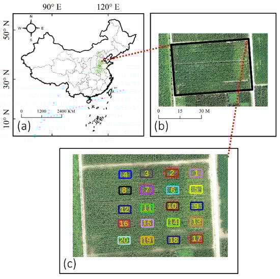 The geo-location of the Nanpi Eco-Agricultural Experimental Station (NEES) and the detailed setting of 20 plots with different treatments of fertilizers. (a) the geographical location of experimental station, (b) the study area from UAV view, (c) the 20 plots for image clipping.