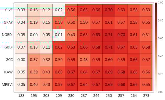 Similarly, commonly applied multispectral-based VIs were extracted (Table 2). The reflectance of soil was quite different from the reflectance of maize in the red band (720 nm) and the near-infrared band (800 nm) [,,]. Then, the pixels that only contained maize and the pixels that only contained soil were sampled, and the reflectance of each was obtained using IDL. It was found that the reflectance lower than 0.04 in the red band and higher than 0.4 in the near-infrared band were defined as maize, and the remaining pixels were defined as soil. Then, various multispectral-based VIs were calculated based on pixels that only contained maize.