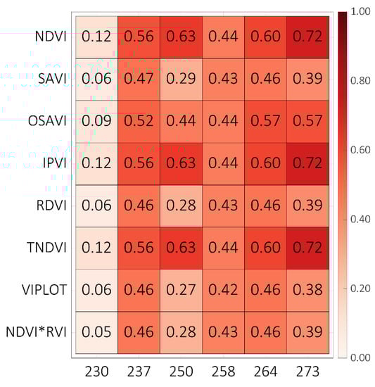 The multispectral-based VIs of 20 plots at different growth periods were separately linear regressed with maize grain yields (Figure 5). The data collected on 237 DOY were more correlated with maize grain yields. The tasseling dates ranged from 230 to 237 DOY for 20 plots, and the higher R2 values achieved from 230 DOY indicated that the accuracy of yield prediction using data collected from tasseling date to maturity date was higher. The multispectral-based VIs from 230 to 273 DOY were selected for further predicting maize grain yields.