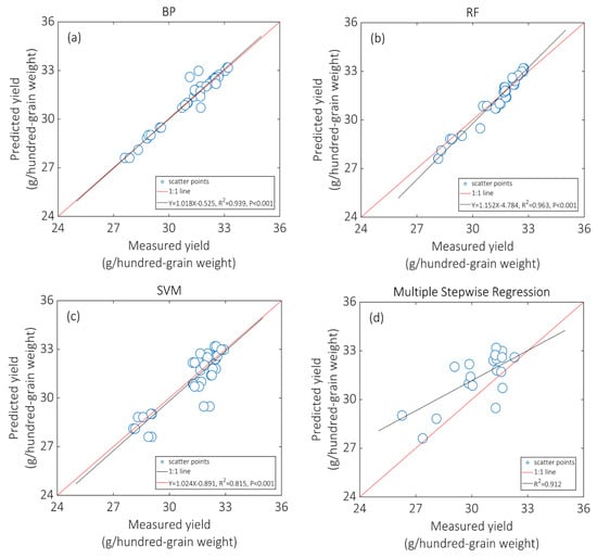 The comparison of measured and predicted maize grain yields using three machine learning methods and the stepwise regression model (SRM). Note: (a–d) represent the results using BP, RF, SVM and SRM, respectively.