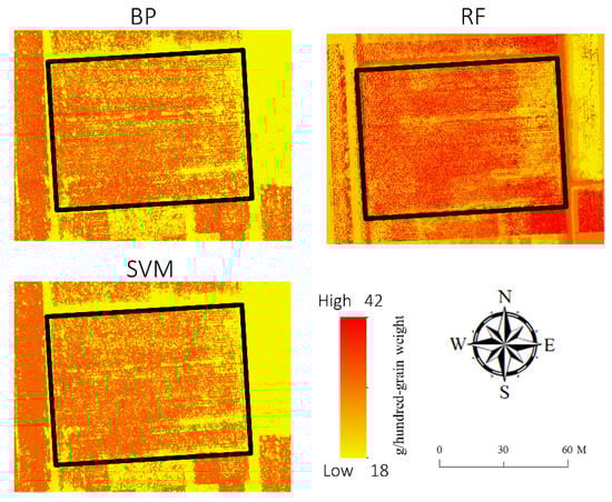 For the machine learning-based methods, the R2 values using BP, RF, and SVM were 0.939, 0.963, and 0.815, respectively. Similarly, the RMSE values using BP, RF, and SVM were 0.496, 0.489, and 0.823 g/hundred-grain weight, respectively. The BP and RF both performed better than SVM, with higher R2 values and lower RMSE values. For the results using SRM, the R2 was 0.912, and the RMSE was 1.772 g/hundred-grain weight. Therefore, the machine learning-based methods have greater potential for predicting maize grain yield, and the RF achieved the highest accuracy. The optimized parameters of the machine learning-based models were applied for mapping maize grain yields (pixel-based optimal indices collected at optimal growth stages) (Figure 7).