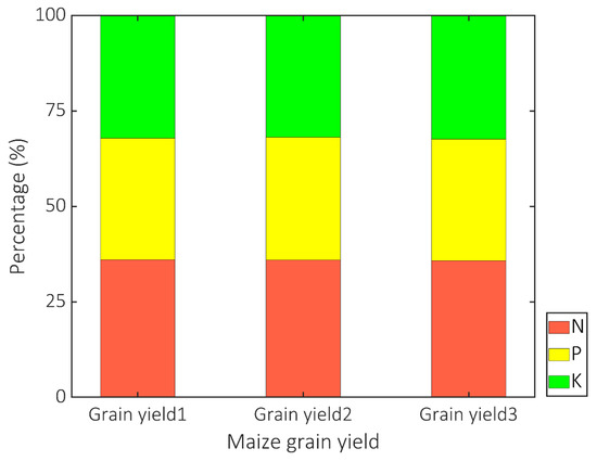 The grey relation coefficients (GRCs) between each type of fertilizer and yields calculated using the grey relation analysis (GRA) are shown in Figure 8. The GRC values were 35.707, 34.435, and 29.857% for the maize grain yield1, 36.417, 32.606, 30.975% for maize grain yield2, and 35.926, 33.084, and 30.989% for maize grain yield3. The results show that N is the dominating influencing factor for the growth of maize.