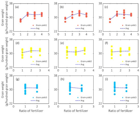 The changes in N, K, and P fertilizers with the corresponding variations of maize grain yields are shown in Figure 9. It can be clearly noted that the impacts of different ratios of fertilizer to maize grain yields varied significantly. For N, the maize grain yields increased with the addition of N, until the ratios increased between 2 and 3 (Figure 9a–c). The optimal application ratio of N was 2. For P and K, the maize grain yields merely changed with the adding of these two fertilizers. Most of the circumstances in subplots from Figure 9d to Figure 9i showed decreased maize grain yields due to the increased usage of P and K. The optimal application ratios for P and K was 1. It can be deduced that the optimal combination ratio of N/P/K is 2:1:1.