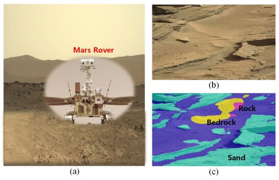Intelligent environmental perception is a necessity for planetary rovers toward autonomous driving, which provides crucial semantic information, e.g., identifying feasible driving areas and surrounding obstacles. For such a panoptic perception mission, terrain segmentation is the most critical procedure, which also can be viewed as a semantic segmentation task. Semantic segmentation is a widely used perception method for self-driving vehicles on earth that can assign a separate predefined class label to each pixel of an image [1] it is the foundation of many high-level tasks that need to infer relevant semantic information from images for subsequent processing. This applies on self-driving vehicles on Mars as well. Therefore, this study explored the task of terrain segmentation on the Martian surface, aiming to characterize semantic information from rover images. As shown, the Figure 1a shows the Tianwen-1 Zhurong rover, China’s first Mars rover, which is undergoing its fantastic exploration on the red planet. RGB sample images of the Mars surface and the corresponding terrain segmentation annotation are depicted in Figure 1b,c, respectively. It can be observed that semantic segmentation is a pixel-level dense prediction task, which requires an in-depth understanding of the semantics of the entire scene and is in some ways more challenging than those image-level prediction tasks.