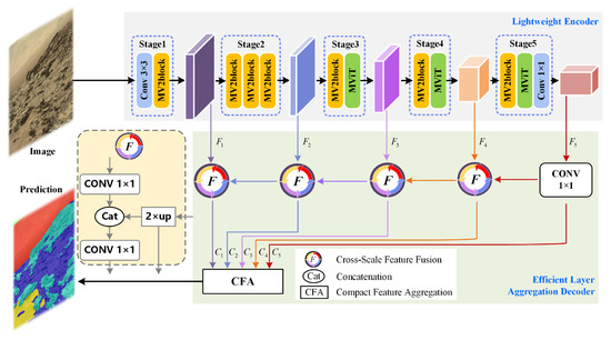 In order to further model and fuse multi-level information from the feature encoder, we design an efficient layer aggregation decoder (ELAD) consisting of two primary elements: cross-scale feature fusion (CFF) module and compact feature aggregation (CFA) module in SegMarsViT, as shown in Figure 4. In ELAD, CFF modules are designed to interact multiscale information and strengthen the feature representation learning of lightweight backbone network, and the CFA module is conducted to efficiently aggregation multi-scale deep features and obtain the final segmentation results.