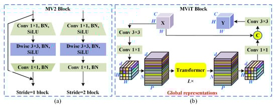 Two types of building blocks in MobileViT backbone: (a) MV2 block; (b) MViT block.