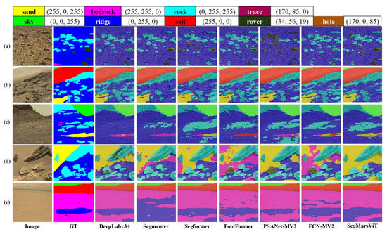 Figure 6 shows the ground truth segmentation maps of five sample images along with their predicted segmentation maps. It can be observed that the proposed SegMarsViT has much better comparative results in scenes. As shown in the last two rows of Figure 6, our method can work well on several kinds of complex scenarios with noisy information, while others may fail in such scenarios. It can be seen from the overall detection effect that the main Martian terrain feature can be extracted. However, missed detections and error detections of some objects existed, and the segmentation accuracy needs to be further improved.