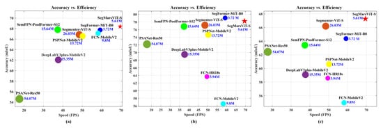 Speed and accuracy comparison on three datasets, (a) AI4Mars; (b) S5Mars; (c) MSL-Seg. Compared with other regular semantic segmentation methods, the proposed SegMarsViT is competitive.