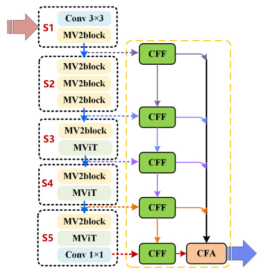 The overall structure of the proposed SegMarsViT is illustrated in Figure 2. This paper is dedicated to the encoder–decoder segmentation architecture through ViT modules. The whole SegMarsViT is a novel combination of CNN and transformers to some extent, which has the local advantage of CNN and the long-range dependency merit of a transformer. The proposed network utilizes MobileViT backbone to extract corresponding features of five stages (stage1~stage5), whose outputs are denoted as , , , and , with scales of , respectively. In other words, the output feature maps after each stage are down-sampled with strides of . After the backbone, we perform an efficient stage-wise layer aggregation decoder, named ELAD, to generate segmentation outputs. The novel ELAD is designed to make multiscale features more distinguishable to learn representative features for SegMarsViT. In ELAD, a series of cross-scale feature fusion (CFF) modules are proposed to further enhance the context modeling and boost the cross-scale communication, which are built upon the top-down pathway. After obtained, we introduce a compact feature aggregation (CFA) module to ensure that feature maps extracted from different stages can be well merged. As shown in Figure 2, the proposed SegMarsViT is asymmetric and the contracting path is deeper than the expansion path. In what follows, we describe all the structures of the above-mentioned modules in detail.
