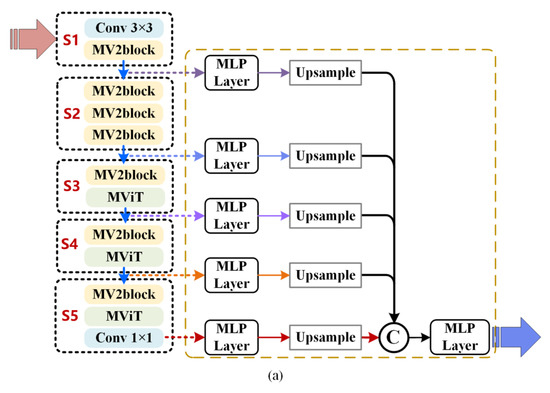 In this subsection, we test the proposed ELAD with different decoders. As mentioned earlier, the proposed efficient layer aggregation decoder (ELAD) consists of stagewise CFF modules and one CFA module in a nutshell, which are constructed in the way shown in Figure 8. In addition, we select two representative decoders (Figure 9a,b) for test: the All-MLP decoder, termed AMD, first proposed in SegFormer [38], and the classic decoder of the U-shaped network [11], termed UNetD. In practice, we use the official code provided by the authors to implement our experiments. From Table 9, with the same encoder, e.g., MobileViT-s encoder, we find that the proposed ELAD produces higher performance.