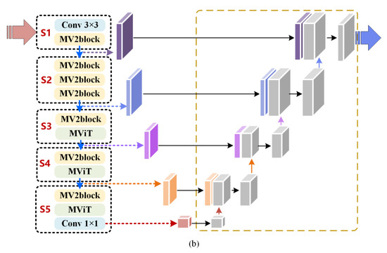 Considering the strict complexity limitations on the spaceborne payload hardware, we use MobileViT as the backbone to accelerate feature extraction and improve the real-time performance of the proposed method. MobileViT is a lightweight and general-purpose neural network architecture introduced by Apple ML researchers. We removed the last pooling layers and all fully connected layers for image-to-image semantic segmentation prediction. With a special perspective to encode both local and global representations effectively, MobileViT is a hybrid network with both CNN and ViT-like properties. MobileViT improves its stability and performance through incorporating spatial inductive biases of CNN in ViT. As can be seen in Figure 2, the architecture of MobileViT contains the initial fully convolution layer, followed by several MV2 blocks and MViT blocks. Figure 3 visually depicts the design of the two main modules. The MV2 blocks (Figure 3a) come from MobileNetv2 [43] and are mainly responsible for down-sampling in the backbone. Even more to the point, unlike conventional ViTs, the elaborate MViT block (Figure 3b) can learn local and global information with an effective receptive field of .