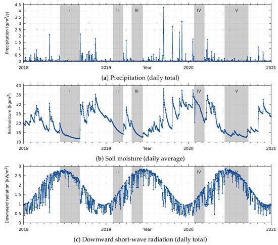 Meteorological parameters (a) daily total precipitation; (b) daily average soil moisture (0–10 cm depth) and (c) average downward SWIR radiation flux [26,27]. Five dry periods longer than 45 days (Table 3) are indicated by a grey-shaded background.